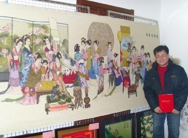 记者注意到这幅《琴棋书画》,绣着18位古装美女,有的在下棋,有的在赏画,有的在弹琴,有的捧书而读,作品中人物动作、神态栩栩如生。这幅绣品荣获大港第四届残疾人文化艺术节工艺美术作品比赛一等奖。绣品制作者就是那位男士,他个头儿不高,看上去二十来岁,是位肢体残疾者。记者询问得知他叫窦福国,来自海滨街同盛居委会。他告诉记者,起先是他媳妇绣十字绣,他在旁边看着,慢慢就有了兴趣,上网查资料、看视频,自学各种针法。
