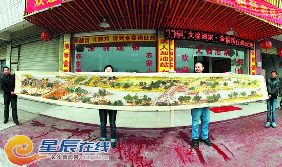昨日,湘潭县易俗河镇的郭泽兰向记者展示了一幅长650厘米、宽71厘米的十字绣《清明上河图》,这是她耗时两年半绣成的作品。