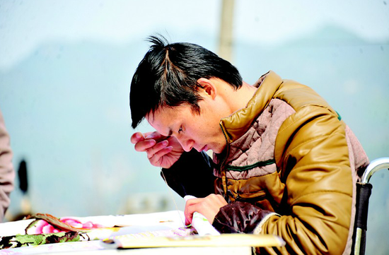 刺绣的青年名叫秦金才,今年26岁。7年前,一次意外事故导致下身瘫痪,腰部以下失去知觉。“老坐着也不行,得找点事做,不能一直拖累父母。”秦金才说着,手中针线并没停下。