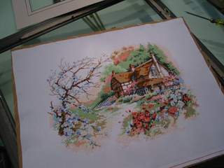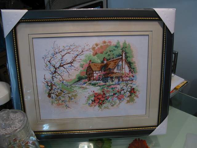 绣好的作品用胶粘在专用薄木板上,待胶完全粘牢后取下绷子,然后配好装饰性的