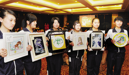 昨日下午,绍兴市职教中心的学生正在展示80余名同学绣成的十字绣作品。当日,为捐助诸暨白血病患者吴叶露,一场十字绣作品“爱心拍卖”在市区风光大酒店举行,不少市民和单位纷纷赶来参加竞拍,奉献爱心。昨天共有23幅十字绣作品被爱心人士拍走,风光大酒店员工还当场捐款。