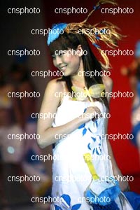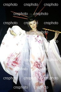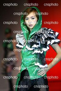 模特展示一款学生设计的活力十足的时装 模特展示一款色彩绚丽的时装 一名模特展示一款设计另类的时装 模特在展示设计师毛戈平的形象设计作品