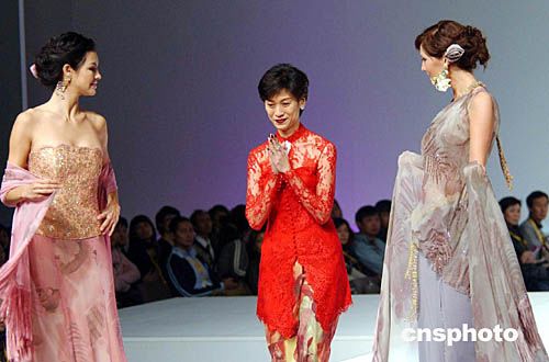 图为香港时装设计师Simone Ng与模特登台谢幕。