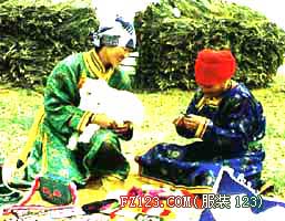 (2)、对比的方法:在刺绣的过程中,还经常使用对比的手法,如大与小,多与少,方与圆,曲与直,疏与密,虚与实,粗与细等等,花与花对比突出其主花,叶与叶之间突出其主叶。蒙古族刺绣中很喜欢对比每的应用,红花绿叶,采用退晕法的方法起到了减弱色相、纯度的作用,形成逐渐过渡的效果,这样处理显得对比强烈而不刺激。