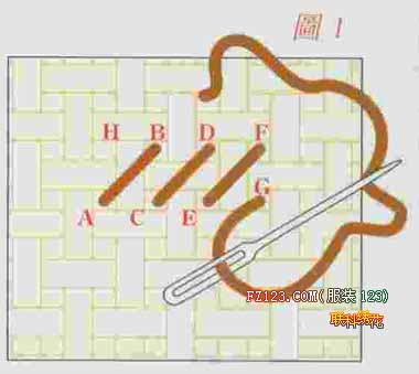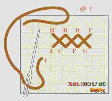 之后,您便可以完成十字针的另一半(请参照图2)。在十字布背面的G位置将绣花针拉出插入D,然后从E拉出插入B,再从C拉出插入H。这样,您已完成第一行的刺绣!现在,向下移一行,数算针步的数目,开始在I的位置绣第二行。