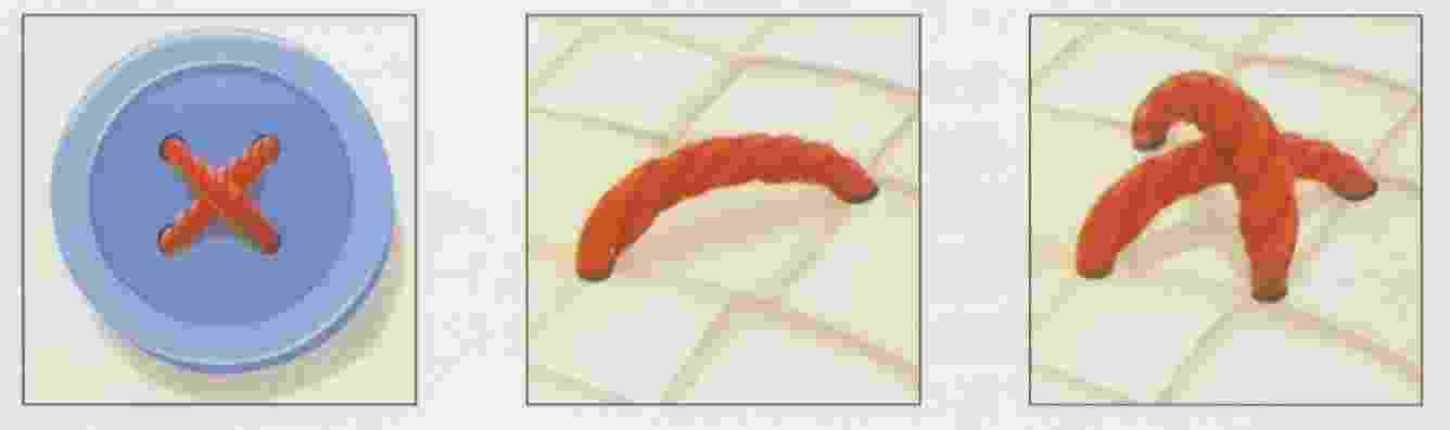 从布的中心点向上数12格,然后向右数两格。您可以从这位置开始刺绣小熊的耳朵。在十字布的背面,将绣花针穿过A孔拉出(请参照图1)然后插入B孔,再从C孔拉出插入D孔。以同样方式,继续多绣半个十字(从E到F)。