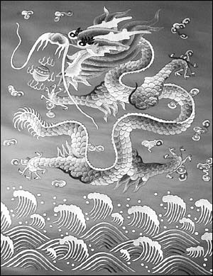 任本荣的压箱宝———“九龙腾江”之一,每幅绣品上都是一只腾云驾雾的猛龙。