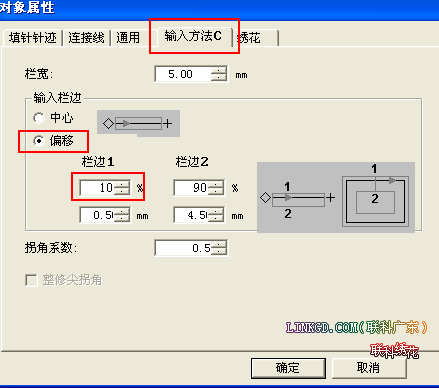 3.画好后再在工具栏中选中选择工具,双击您刚才所画的线条,出来一个对象属性对话框,选中输入方法C对话框,选中“偏移”,在栏边1的数值中输入10,设置如图3所示: |