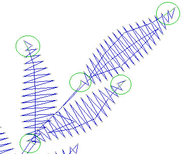 | 其实断线与剪线一样都会使绣花机停顿, 以致影响生产速度。而导致断线的成因有很多,除绣花机及外来的因素外,打版的方法及技术亦可令绣花机不停地断线: 短针步 短针步是指一些低于 0.3mm 以下的针迹,由于针距太短相对拉力却十分高,很容易便会把绣花线拉断。我们可以于打版时先把该类针迹删除,这样断线的次数便会大大减少。TAJIMA DG/ML 打版系统用户只须开启自动删除短针步即可。