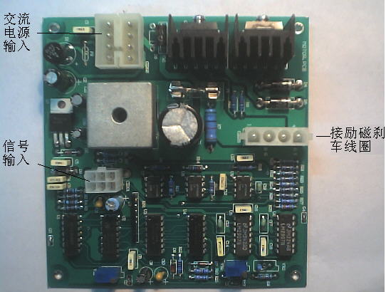 二、简介:线路板提供两组电源,一组为电机线圈两端的电压43V,一组为线路板上芯片的电源电压12V。输入信号有两个频率,一个为设定频率,一个为反馈频率,由安装在主轴上的光电编码器产生,反馈频率反映主轴的转速。线路板根据输入的反馈频率与设定频率相互比较,控制电机的励磁线圈电流大小,当反馈频率<设定频率,电机励磁线圈电流变大,电机转速逐渐升高,使得反馈频率增大,当反馈频率>设定频率,电机励磁线圈电流减小,电机转速逐渐减小,使得反馈频率减小。启动信号控制电机转与停,刹车信号在电机停止时控制刹车线圈,使得电机刹车,保证电机停止的位置准确。