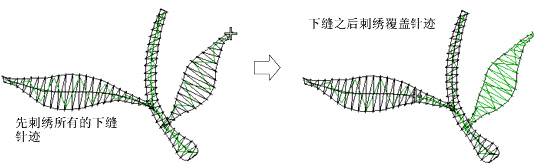 注意:如果组成对象接触或重叠,先为整个分支对象刺绣下缝,再用覆盖针迹刺绣。