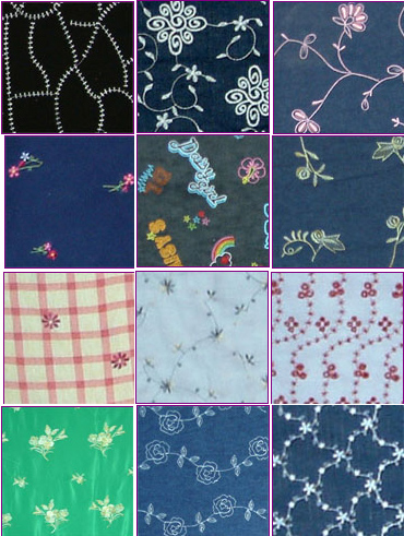 对丝绸、仿真丝、棉布、亚麻布、牛仔布、针织布、装饰布、晴纶棉等各种厚薄型整匹面料,进行整幅彩色、雕孔、统绷绣花,可直接用于服饰、服装、窗帘、围巾、内衣。