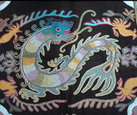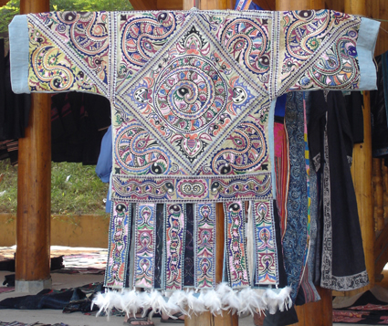 苗族服饰上最常见的纹样是动物形象,其刺绣、织锦图案中对龙与蝴蝶的大量描绘,许多半人半兽的纹样,如人头龙、人头蝴蝶、人头兽、人头鸟等,反映出人类早期以渔猎为主的原始生活状态。