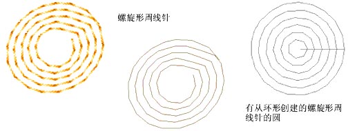 螺旋形周线针创建单个的、连续的、按螺旋形填绣形状的针迹线。它的典型用途是环形和边框,但它也适合其它封闭的形状。