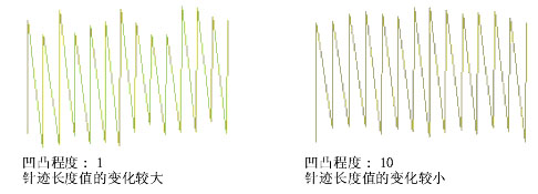 4. 凹凸程度域中输入介于1到10的值来表示要求的凹凸程度。此值越大,针迹长度值的变化就越大,如下图。