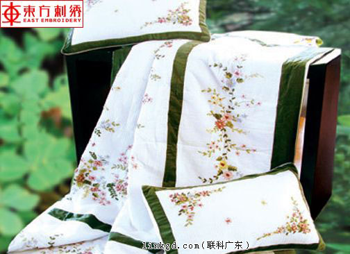 这款床品总体看来很简单,以白色为底,绿色为配色,其中为手绣工艺小花型.目前手绣流主要产品有:手绣工艺品、工艺台布、抽纱刺绣品、手工艺编织品、机绣工艺品、床上用品等六大系列。涵盖了十字交叉绣、回绣、垛绣、堆锦绣、手工贴绣、拉毛套绣、丝带盘花等数十种针法,上千种产品,集传统与现代绣法为一体,将绘图与刺绣工艺结合融汇,创造出了美观大方,极具观赏性和实用性的产品,其中主要产品手绣工艺品与工艺台布尤为美观,这些产品立体感强,栩栩如生,更是深受国内外客户的青睐,产品畅销欧美等国家和地区。
