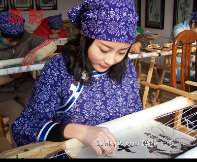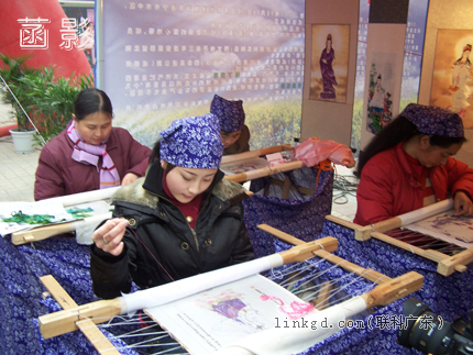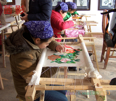 选线,分线,是件细致的活。针头很小,所以眼睛要尖,要快;线越细,绣品就会越有光泽。一副绣品最少也得花上一周,复杂些的十天半个月是常事。听黄姐説,在她的观音绣艺术坊里,绣娘几乎都是当地的村姑和农村妇女,经过培训后既可在艺术坊上班,也可带回家完成绣品,特别适合男人外出打工后的那些留守妇女干,凭她们的一双巧手,在带孩子、照顾老人、做家务、干农活的空隙时间,刺绣挣钱致富,发展当地的观音绣产业经济。