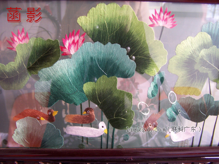 这是那天展示的作品中的一幅——“鸳鸯戏水”屏风!墨绿的荷叶,盛开的粉嫩荷花,荷叶下相互追逐嬉戏的鸳鸯,连水纹也清晰可见……我想你亲眼见到的话,一定会惊叹这一针一线的神奇。我想,当远方的亲人知道自己的家人能够靠自己的双手挣钱的时候,会是多么的骄傲。