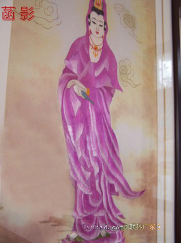 这就是观音绣的主题,真正的观音绣像!它改变了观音的传统印象,给观音换上了淡紫色的服装,是不是看起来更漂亮了,观音身旁祥云环绕,希望慈悲为怀的她能够满足一针针辛苦劳作的绣娘的愿望,也能带给大家幸福平安!