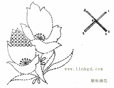 二针半绣又名仿十字绣。机绣借用“十字跳绣”的针法原理运用于台布、枕袋、盘布等品种。既可作为单独针法绣制,也可与其它针法混合使用。具体方法是按布料的经纬定向,以同等距离的针脚宽度作“×”字的跳针绣制。制作步骤是在规定图案的边缘位置起针,以45度斜角向上跳一针,回针后,从同一位置向上跳至二分之一处,按图4-4-9抽丝绣垂直方向往下跳半针。然后回针向上来回一次跳出一个“×”字形。接着在落针处起针,绣第二个“×”字形。十字针的针脚约为3毫米,间距2毫米左右。图案色彩变化时,应随时变换各种颜色的绣线。这种针法具有比较浓郁的民间装饰意味。格调别致,受人喜爱.