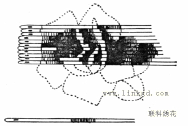 引线包梗绣又称包针绣、钢针绣。这种针法用钢针作为绣制时的衬垫小道具(用缝被针或0.1毫米直径的通长钢针)。依据花朵或风景等图形将钢针平列于底料上。然后按照明暗、色彩逐根来回包绣,绣好后将钢针抽去,使绣制的形象凸出料面,具有明显的立体感。在绣制时钢针长度不够,可抽出后接上继续包绣。在排列钢针时,要注意钢针与面料丝理的平行。如果从钢针穿过的孔位用剪刀将绣线剪开修平,可使花朵及图案形象具有一种毛茸茸的质感,这种针法又称立绒绣或通绒绣。绣制有毛茸感觉的物体如水蜜桃等犹为合适。在表现中国水墨画、写意花卉和水彩画时,立绒绣具有一定的特长。有些花朵的花瓣造型比较简单,块面又较大。在绣制时,可将钢针改成硬卡纸(类似于扑克牌的硬纸都可以),把硬卡纸折成尖角形,其尖端朝向花芯,然后进行包绣,绣好后将硬卡纸抽出。这种绣法较钢针绣别具一格,又称“环花针”。