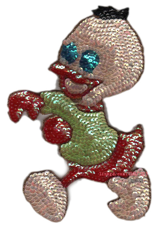 亮片绣由若干亮片和针迹构成。亮片选用质地较硬、表面平整、光洁度高的材料,配合不同颜色、尺寸和形状,使绣品独具效果。