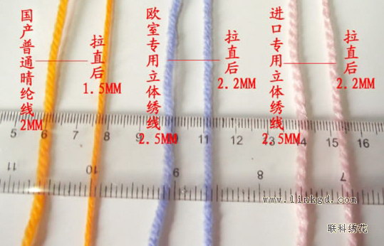 (3)进口立体绣线:事实上,进口立体绣线直径约为2.5MM,当它拉直拉开后,直径约为2.2MM。这才是立体绣线最适合的尺寸,如图: