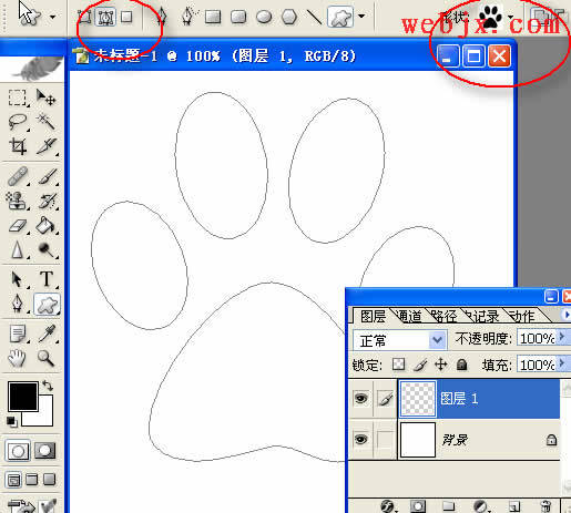 首先新建立一个400*400,72dpi,颜色模式RGB的文档,背景白色。新建立一图层,然后使用钢笔工具绘制如下形状。