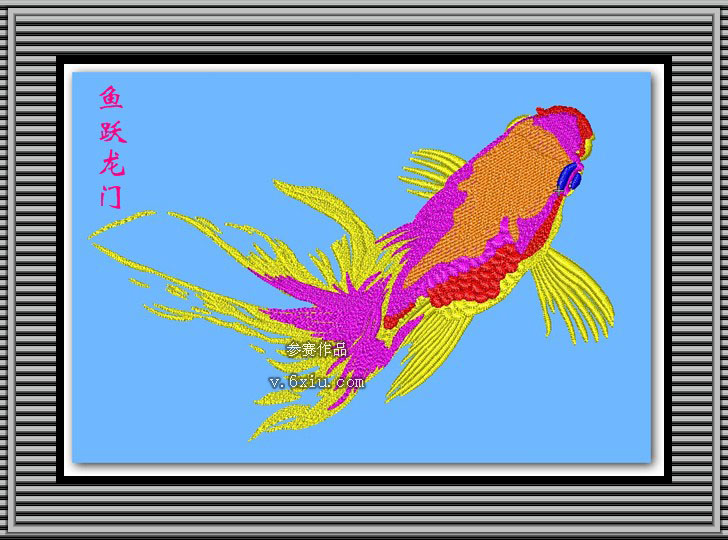 作者:王锦财 参赛作品名:鱼跃龙门 花版介绍:此花形由几种针法制作而成,针法比较普通,但凡事都是越简单将会越真实。就好象做人一样,简简单单才是真!愿大家都可以“鱼跃龙门,梦想成真”! ==下载DST文件== 作品效果图: