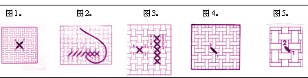 全十字针(X):十字针要与图中每一方格相对应,如(图1);横排十字针可以采用来回绣的方法,如(图2);而竖排十字针可按(图3)所示进行刺绣。