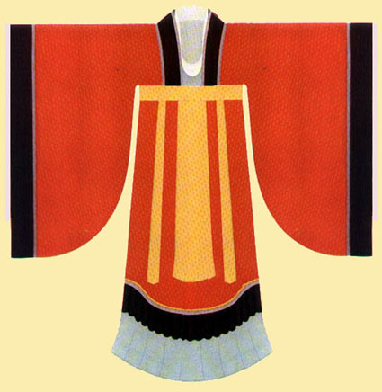 唐代文吏服饰--唐代官吏,除穿圆领窄袖袍衫之外,在一些重要场合,如祭祀典礼时仍穿礼服。礼服的样式,多承袭隋朝旧制,头戴介帻或笼冠,身穿对襟大袖衫,下着围裳,玉佩组绶等。本图为唐代文官大袖礼服展示图(根据出土陶俑及壁画复原绘制)。