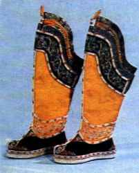 清代皇帝服饰 清代男子鞋履,便服以鞋为主,公服才穿靴。靴子的材料多为黑缎,式样初尚方头,后又流行尖头。清代皇帝服饰有朝服、吉服、常服、行服等。皇帝穿朝服则用方头朝靴,朝靴与服色相同,并饰黑色边饰,上面绣有草龙花纹。本图为清代康熙绣钩藤缉米珠朝靴。