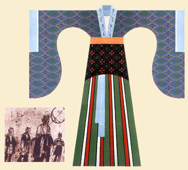 魏晋南北朝时期妇女的衫裙 图为穿大袖衫、间色条纹裙的贵妇、侍从(敦煌莫高窟壁画)及大袖衫、间色裙穿戴展示图(根据敦煌莫高窟供养人壁画复原绘制)。在敦煌莫高窟甬道的两侧及佛教故事的下方,往往有一行行排列整齐的男女,小的仅有数寸,高的竟达几尺。他们中间有权势显赫的官吏,也有普通的平民百姓。这些人物,都为修造洞窟出过资金,他们把自己的形象画在壁上,表示该窟的菩萨佛像都由他们供养,所以被称为窟主,也被称为供养人。很多供养人的身旁都附有题记,写明年代、职衔、排行及姓氏等等。本图所绘的服饰,在当时带有普遍性,河南洛阳等地出土的陶塑妇女,也穿这类服装。其特点是:对襟、束腰,衣袖宽大,袖口缀有一块不同颜色的贴袖。下着条纹间色裙。当时妇女的下裳,除穿间色裙外,还有其他裙饰。晋人《东宫旧事》记太子之妃服装,有絳纱复裙、丹碧纱纹双裙、丹纱杯文罗裙等名色。可见女裙的制作已很精致,质料颜色也各不相同。