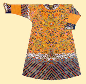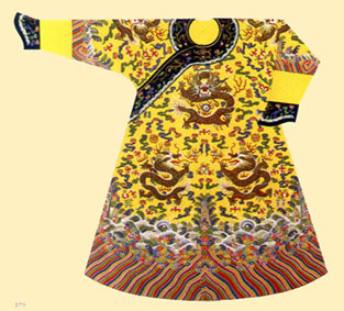 清代皇帝服饰 清代皇帝服饰有朝服、吉服、常服、行服等。皇帝的龙袍属于吉服范畴,比朝服、衮服等礼服略次一等,平时较多穿着。穿龙袍时,必须戴吉服冠,束吉服带及挂朝珠。龙袍以明黄色为主也可用金黄杏黄等色。古时称帝王之位,为九五之尊。九、五两数,通常象征着高贵,在皇室建筑、生活器具等方面都有所反映。清朝皇帝的龙袍,据文献记载,也绣有九条龙。从实物来看,前后只有八条龙,与文字记载不符,缺一条龙。有人认为还有一条龙是皇帝本身。其实这条龙客观存在着,只是被绣在衣襟里面,一般不易看到。这样一来,每件龙袍实际即为九龙,而从正面或背面单独看时,所看见的都是五龙,与九五之数正好相吻合。另外,龙袍的下摆,斜向排列着许多弯曲的线条,名谓水脚。水脚之上,还有许多波浪翻滚的水浪,水浪之上,又立有山石宝物,俗称“海水江涯”,它除了表示绵延不断的吉祥含意之外,还有“一统山河”和“万世升平”的寓意。