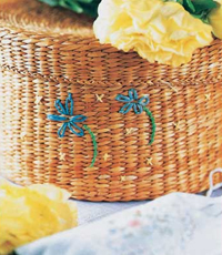 盛开在篮子上的刺绣花朵 用藤条编织的收纳篮子,纹路清晰明了,并且有空隙,所以很容易在上面绣上各种图案。篮子上的花朵和细枝,以及细密的十字形点缀图案绣法都十分简单易行。如果家中有这种编织方式的篮子,可以尝试用这种方法装饰一下。 |