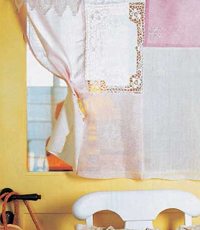 房间入口处的刺绣隔断帘 玄关入口或者厨房门口处,适合进行简单的隔断。在这里挂上帘子的话,不但能起到阻隔视线的作用,还能产生很好的装饰效果。 制作帘子时最好选择稍薄的材料,准备大小不同的几块布料,分别绣上需要的图案。最后,用针线将布料缝缀成为帘子就可以了。如果觉得刺绣有点困难的话,可以利用已经绣有图案的手帕,也不失为一种好方法。 |