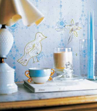 刺绣装饰的墙面壁纸 有没有想过印花壁纸上出现刺绣图案会是怎样的一种效果呢?把手工刺绣的花鸟图案粘贴在壁纸上,会使空间看上去更加柔和,并富有意境。 先把布料剪成需要的形状,然后用不同颜色的彩线进行刺绣,使用浮雕效果针脚法绣鸟的身体,鸟嘴和鸟爪用了阴影针脚法。 |