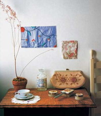 用小块绣片装饰卧室墙面 我们可以用精美的小块刺绣制品装饰卧室墙面。绣片整体颜色的选择不宜与居室色调有太大的反差。把绣片剪裁成适当大小,用双面胶粘贴在墙上就可以了。梳妆台上再放上刺绣手提包和有谐调的花朵图案的梳子、化妆盒等物品,与墙上的绣片装饰相得益彰。 |