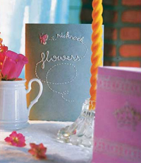 绣在纸质卡片上的图案 一说起刺绣,人们往往会想到在布料上绣出各种图案。其实,只要是针线可通过的材料,都可以在上面进行刺绣。 朋友或家人过生日时,送上一张绣有图案及祝福语句的自制卡片,将会更加凸显你的心意,同时带给他人一份惊喜。制作卡片最好选择较厚的纸张,先在纸上用粉笔画出想要刺绣的图案,然后绣上去就可以了。 |