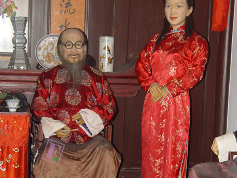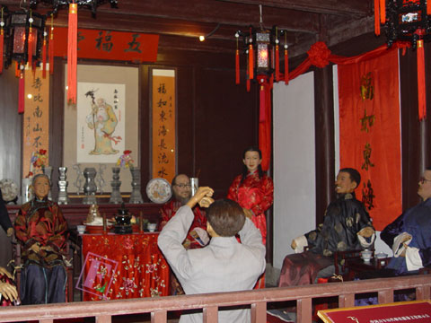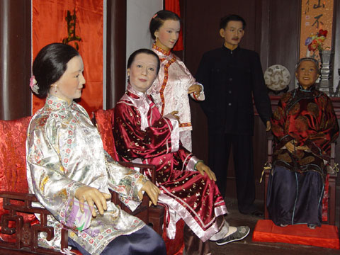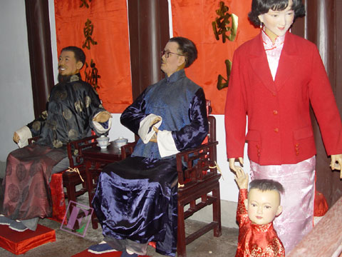 1911年辛亥革命后,剪辫发,易服制,人们闻风而动,西洋文化东渐,中国服装发生了一次巨大的变革。但西装革履与长衫马褂并行不悖,男子开始穿着西装,但原来的服装仍用作礼服。妇女服饰由简入繁,日新月异。以下景主要表现民国初年浙东一带五世同堂、合家祝寿的衣冠服饰。