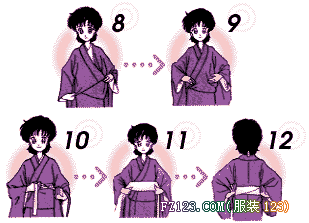 4. 决定幅宽后,慢慢把底面打开,接着把底面合身定宽,然后把右手所拿着的领子下部提高10厘米,使下摆线呈倾斜状。5. 再接着整理正面,将左手所拿的领子下部分提高5厘米,注意不要错位。把腰间出现的皱折往上调整。6. 在腰间系上第一根细绳。带子从身体正面往后系,在背中交叉后绕回到前面打结。7. 把腰间的皱折拉平。手从和服袖根下的开衩处伸进去检查和服是否被带子夹住,弄平背后因为长而余出的部分。