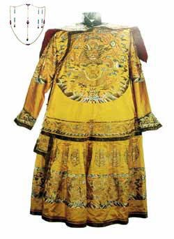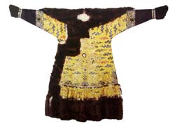 皇帝礼服之一,有冬夏之分。在隆冬季节,外面套上端罩。端罩是用紫貂或黑狐皮造的外衣;毛面,呈黑或褐色。这件冬朝服,披领及裳为紫貂皮,袖端是熏貂皮。衣表明黄色,右袵,上衣下裳相连,箭袖。其绣文,两肩及前后胸绣正面五爪龙各一条.前后胸下方有行龙四条,裳折迭处有行龙六条,前后列十二章。十二章是古代帝王服装纹饰,即日、月、星辰、山、龙、华虫、宗彝、藻、火、粉米、黼(音:府)、黻(音:弗)十二种花纹。清代只有皇帝的朝服、吉服才有十二章。据说各有含.意:日内画金鸡;月内画玉冤;星辰画北斗七星或三颗星,用意取其照明;山画山形,取其镇;龙取其变;华虫画雉,取其文绘;宗彝画虎和(音:柏,一种长尾猴)二兽,取其孝;藻画水草,取其洁;火画火焰,取其明;粉米画碎者为粉,整者为米,取其养;黼形若斧,颜色半黑半白,取其断;黻形若两弓相背,半黑半青,取其辨。这件是康熙帝穿的朝服。