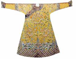 宫中袍褂用料十分讲究,各种绸、缎、纱、罗、缂丝以及用孔雀羽毛、金线、穿珠装饰的衣料,都是由宫中派员到江宁、苏州、杭州三织造衙门监督生产的。袍、褂等衣服也是由宫廷如意馆画师先画样,经皇帝审定,由三织造制造的。 |