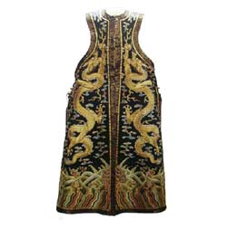 皇后礼服之一。穿时套在朝服外。于册封、寿辰等典礼中穿用。这件乾隆时的朝挂是常用的样式。对襟,无袖,长与朝服齐。片金衣边。石青缎衣表上绣五彩云金龙文,前后身立龙各二条,下幅八宝立水。