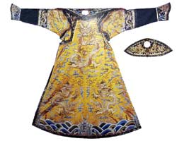 龙袍是一般节日穿的。明黄色.右袵,箭袖,两开裾。袖为石青色。袖端正龙各一,袖相接处行龙各二。衣纹与龙褂相同。领圈前后正龙各一,左右交襟行龙各一。领后垂明黄绦,饰有珠宝。这件明黄色缂丝五彩云金龙八团龙袍,乾隆年制。仅缂丝就要用一千余工。皇后还有一种五彩云九金龙的龙袍。皇太后、皇贵妃龙袍与皇后相同。贵妃、妃龙袍金黄色,嫔香色,领后皆垂金黄绦,饰以杂宝。