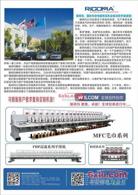 瑞珂玛绣花机公司 专业制造绣花机,展现完美刺绣。产品齐全,有适合小型工厂和设计公司用的(单头帽绣十成衣绣系列,多头帽绣十成衣绣,)以及绣花行业和服装厂家用的(1-30头高速平绣,毛巾绣+平绣+珠片绣三和一绣机)。公司拥有20多年的技术和经验,以研发+制造+生产+销售+服务,为一体,技术已经是绣花机行业里面的领先公司,用心装配每一台机器,诚心为广大客户服务,尽心做到完美,欢迎有需要来电咨询15999547156吕经理 QQ:1092652173 1271713909