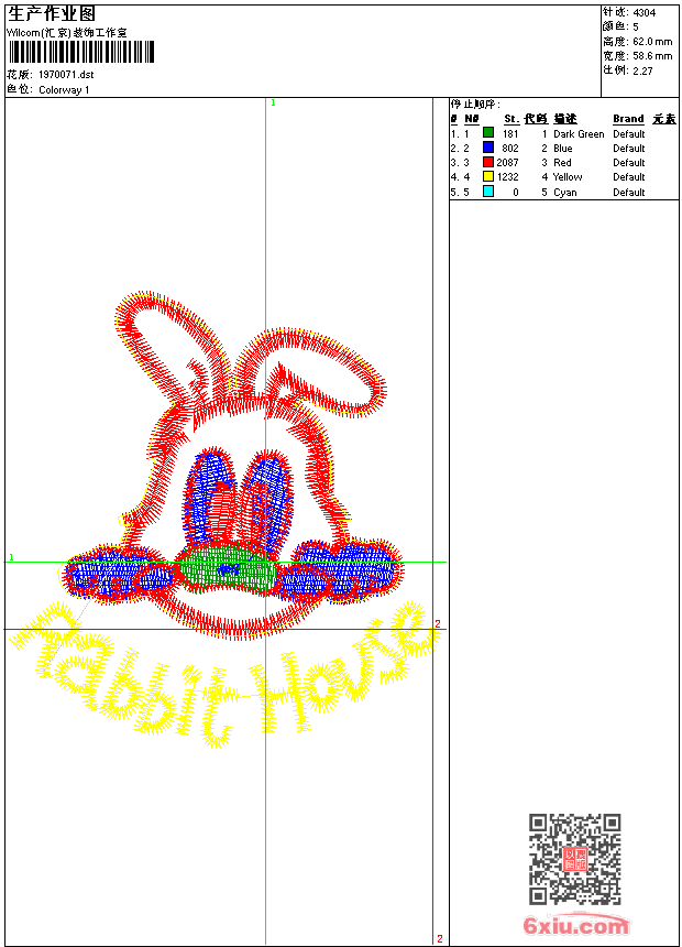 免费童装卡通花样 花版参数: 大小:13.11 KB / 尺寸:59*62[毫米] / 针数:4304针 / 线色:5 / 格式:dst / 版本:7 版带文件需绣花软件方可打开,可配色打印导出各种格式或直接上机绣。如无绣花软件可下载1:1模拟效果图。 图片信息:大小:53.94 kb 222 x 235(像素) dst下载 1:1图下载 关闭 花样推荐 免费童装卡通花样 免费童装卡通花样 免费童装卡通花样 免费童装卡通花样 免费童装卡通花样 免费童装卡通花样 免费童装卡通花样 免费童装卡通花样 免费童装卡通花样 免费童装卡通花样 上一个花样:免费童装卡通花样 下一个花样:免费童装卡通花样