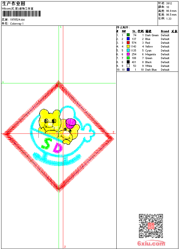 免费童装卡通花样 花版参数: 大小:11.96 KB / 尺寸:99*99[毫米] / 针数:3912针 / 线色:10 / 格式:dst / 版本:7 版带文件需绣花软件方可打开,可配色打印导出各种格式或直接上机绣。如无绣花软件可下载1:1模拟效果图。 图片信息:大小:101.42 kb 373 x 375(像素) dst下载 1:1图下载 关闭 花样推荐 免费童装卡通花样 免费童装卡通花样 免费童装卡通花样 免费童装卡通花样 免费童装卡通花样 免费童装卡通花样 免费童装卡通花样 免费童装卡通花样 免费童装卡通花样 免费童装卡通花样 上一个花样:免费童装卡通花样 下一个花样:免费童装卡通花样