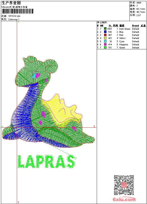 免费花样 花版参数: 大小:13.65 KB / 尺寸:50*60[毫米] / 针数:4489针 / 线色:7 / 格式:dst / 版本:7 版带文件需绣花软件方可打开,可配色打印导出各种格式或直接上机绣。如无绣花软件可下载1:1模拟效果图。 图片信息:大小:53.55 kb 188 x 228(像素) dst下载 1:1图下载 关闭 花样推荐 免费花样 免费花样 免费花样 免费花样 免费花样 免费花样 免费花样 免费花样 免费花样 免费花样 上一个花样:免费花样 下一个花样:免费花样