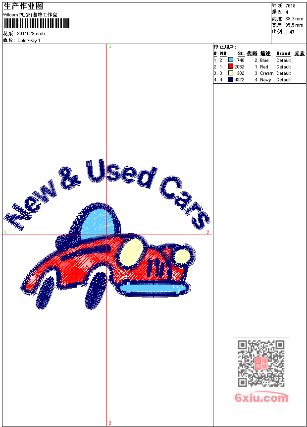 免费花样 花版参数: 大小:58.00 KB / 尺寸:96*70[毫米] / 针数:7618针 / 线色:4 / 格式:emb / 版本:e1.5 版带文件需绣花软件方可打开,可配色打印导出各种格式或直接上机绣。如无绣花软件可下载1:1模拟效果图。 图片信息:大小:102.21 kb 362 x 264(像素) emb下载 1:1图下载 关闭 花样推荐 免费花样 免费花样 免费花样 免费花样 免费花样 免费花样 免费花样 免费花样 免费花样 免费花样 上一个花样:免费花样 下一个花样:免费花样